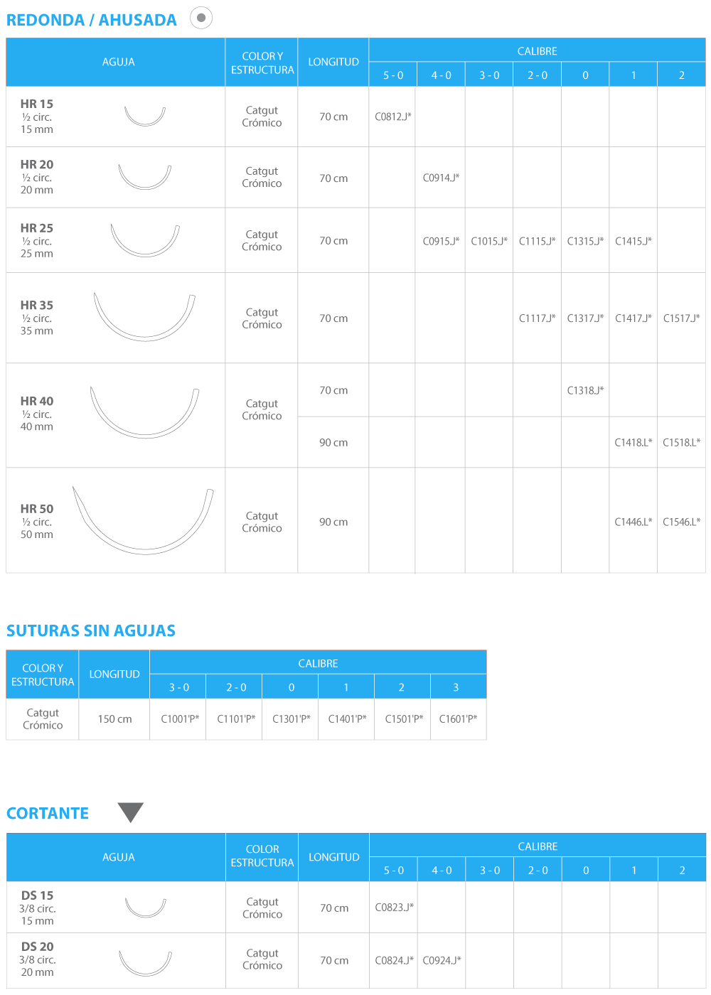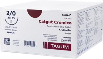 Obtenido por la torsión de filamentos de colágeno purificado de serosa bovina, previamente tratados con sales de cromo. Este tratamiento proporciona al hilo un color marrón característico y mantiene la resistencia tensil del mismo in vivo al incrementarse el período de absorción.